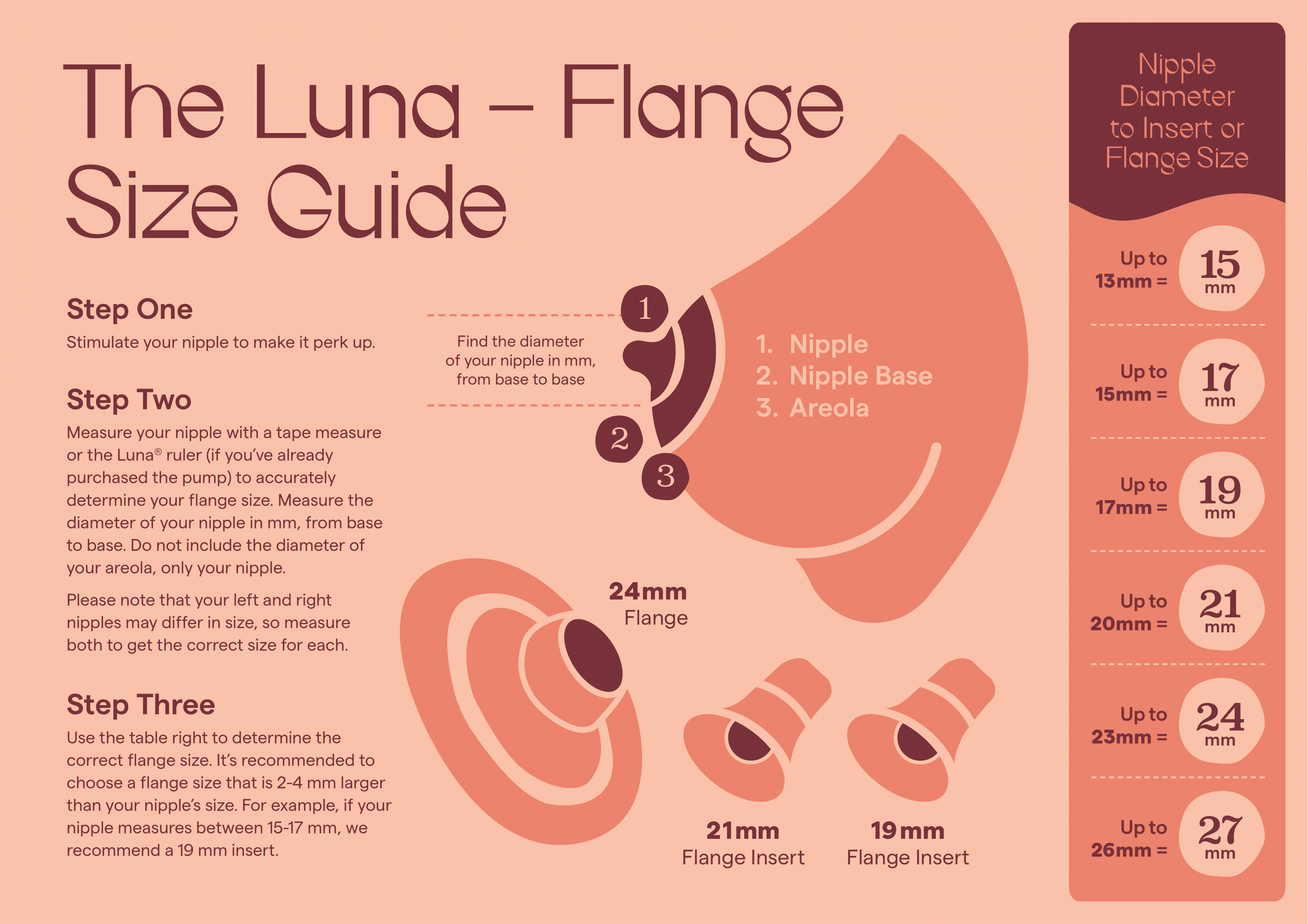 Flange sizes typically range from 13 to 27mm, depending on the brand. This measurement refers to the beginning of the flange tunnel, not the flange opening. The Luna® Pump includes a standard 24mm flange, a nipple ruler to help you find the right size and inserts ranging from 17mm to 21mm to accommodate a variety of nipple sizes.